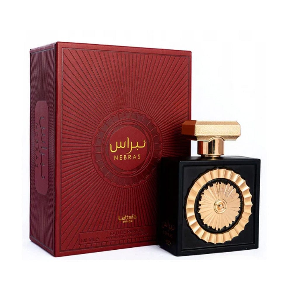 Nebras de Lattafa Perfumes es una fragancia de la familia olfativa Ámbar Vainilla para Hombres y Mujeres. Esta fragrancia es nueva. Nebras se lanzó en 2022. Las Notas de Salida son bayas rojas y mandarina; las Notas de Corazón son vainilla, cacao y rosa; las Notas de Fondo son azúcar, haba tonka, ámbar y almizcle.